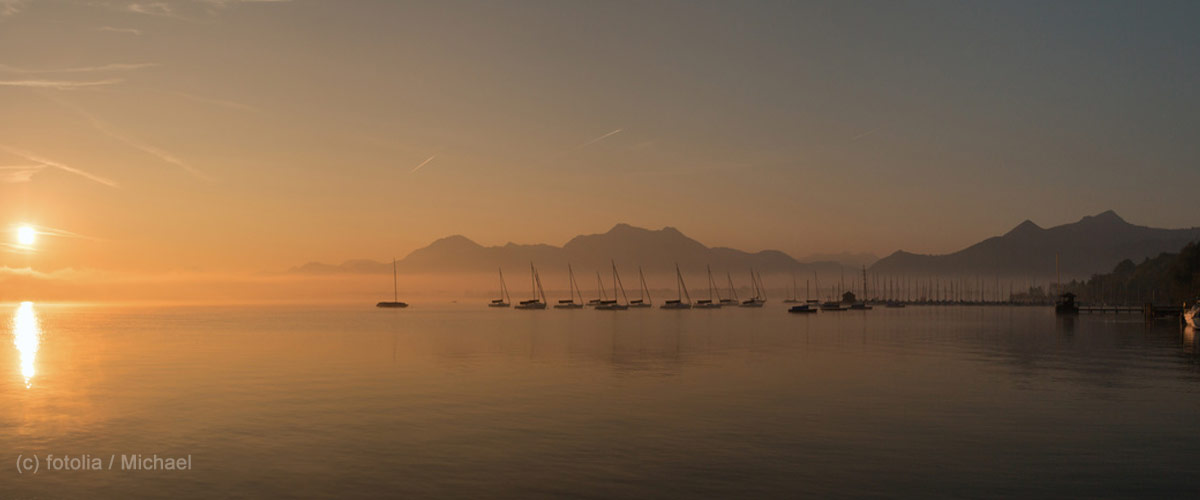 Eine Reise zum Chiemsee – ob Kurzurlaub, Wellness-Reise, nur ein Wochenende, Radreise, Winterurlaub, Wanderurlaub oder anderes – lohnt sich. Und zwar fast zu jeder Jahreszeit. Wandern, Radfahren rund um den Chiemsee und entlang der eher sanften Hügel oder im dahinter liegenden Hochgebirge der Alpen ist ein wahres Vergnügen inmitten saftiger Wiesen und bayerischer Gemütlichkeit. Der größte See Bayerns kann ausserdem mit dem Schloss Herrenchiemsee, der Herrinsel und der schönen Nachbarinsel Frauenchiemsee aufwarten. Burg Tittmoning und Schloss Pertenstein runden das kulturelle Angebot ab. Die Orte Prien, Chieming, Gastdt, Bernau am Chiemsee liegen direkt am See. In der näheren Umgebung finden sich für eine Urlaub am Chiemsee auch Bad Endorf, Aschau im Chiemgau, Staudach-Egerndach und Marquartstein sowie Inzell. Die Region Chiemgau kann ausserdem mit zahlreichen Thermen bzw. Schwimmbädern und einer hervorragenden Gastronomie aufwarten.